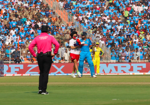 आज अहमदाबाद के नरेंद्र मोदी स्टेडियम में चल रहे क्रिकेट वर्ल्ड कप के फाइनल मैच के दौरान एक अजीब तस्वीर सामने आई जिसे देखकर सभी चौंक गए, मैच के दौरान भारी सुरक्षा में चूक सामने आई। भारत-ऑस्ट्रेलिया के मैच के बीच ग्राउंड पर अचानक एक फिलिस्तीन समर्थक घुस आया। वो जबरन बैटिंग कर रहे विराट कोहली से लिपट गया। मैच में घुसे युवक ने चेहरे पर मास्क और 'आजाद फिलिस्तीन' लिखी टी-शर्ट पहनी हुई थी।